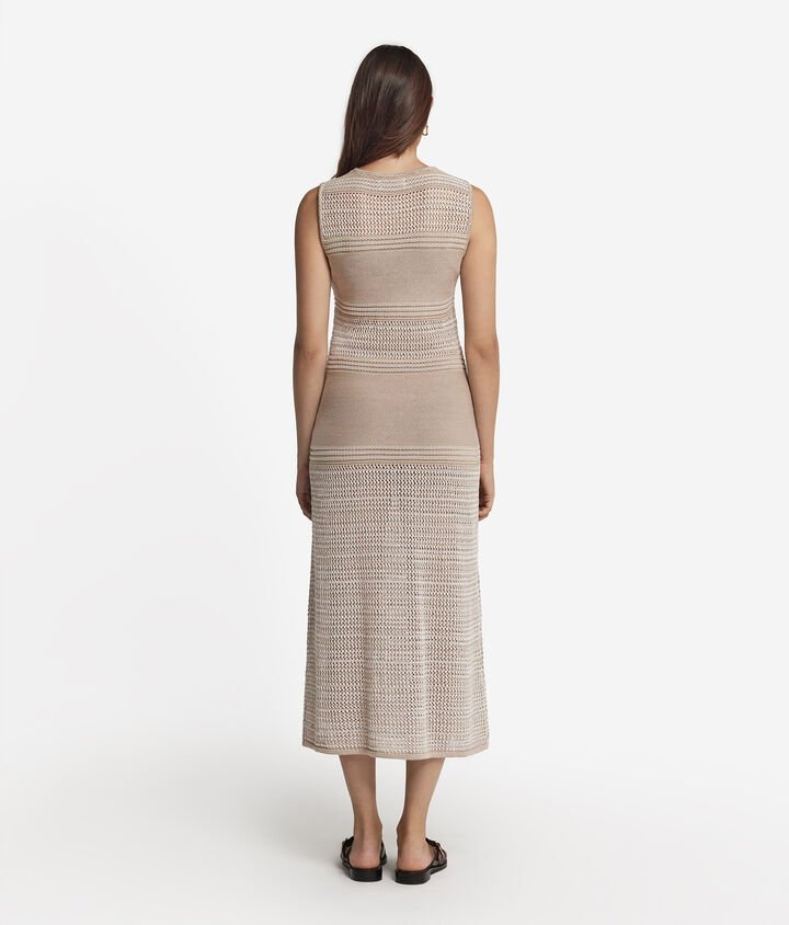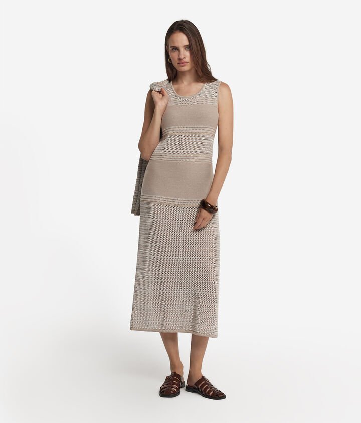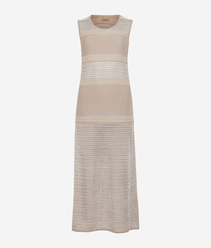A fine openwork stitch pattern enriches the light texture of this cotton and linen dress. The lamé yarn, delicately woven into the fabric, lends subtle brightness and a touch of class to the design. The slim fit emphasizes the silhouette, while the calf length lends a modern, sophisticated touch, perfect for special occasions or an elegant daytime look.