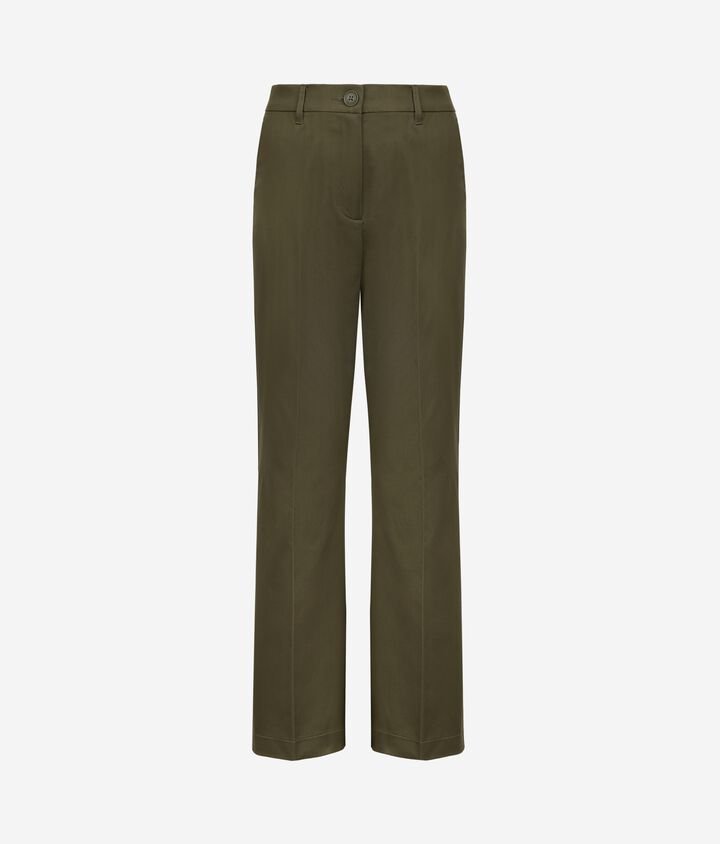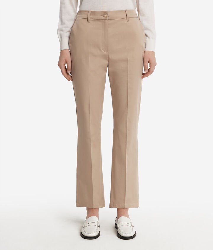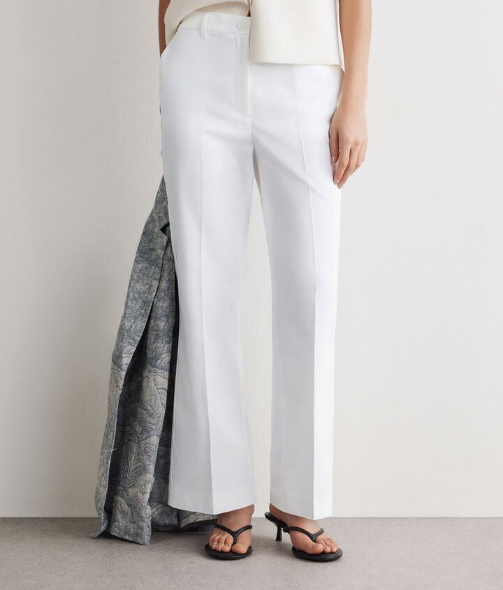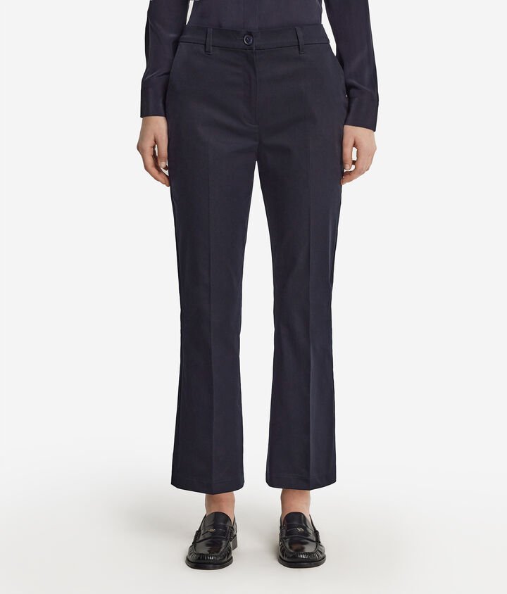 Casual taste blends with essential lines in these flared pants made of stretch cotton. The back strap and welt pockets enhance the piece, providing a refined touch to the design. With a slim fit and ankle length, it is ideal for a variety of outfits, combining style and functionality.