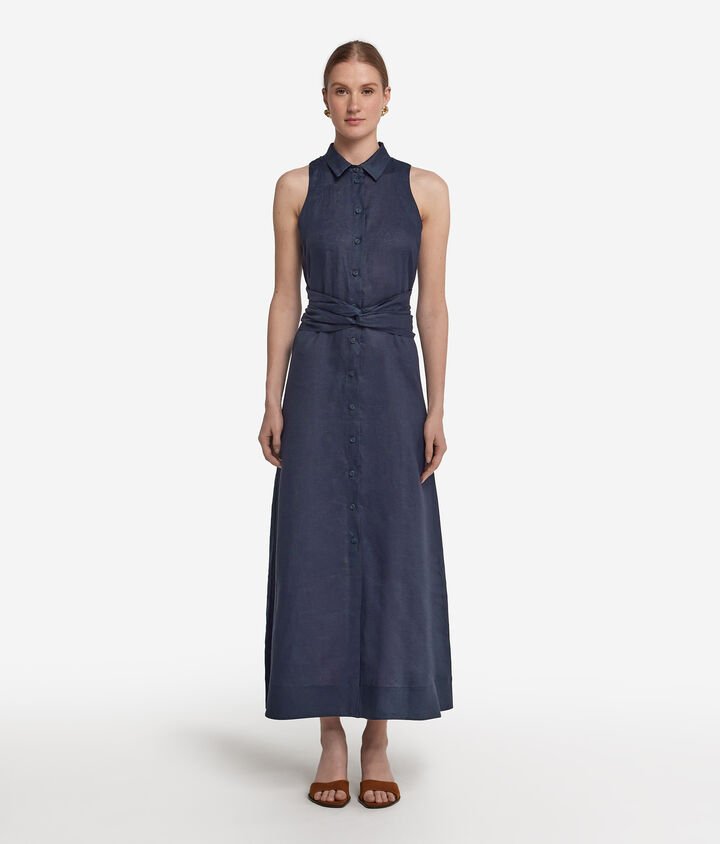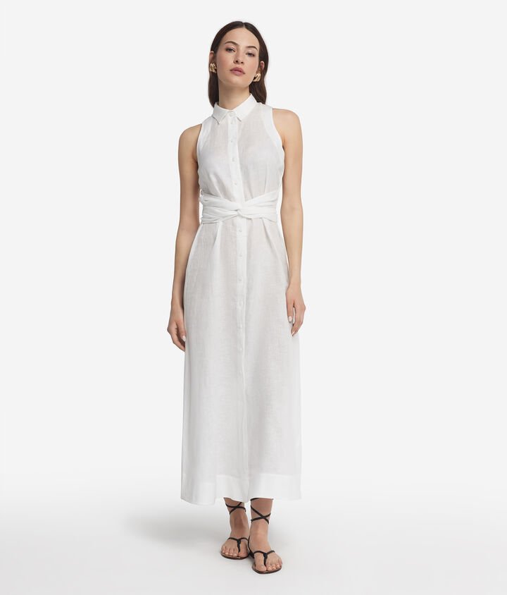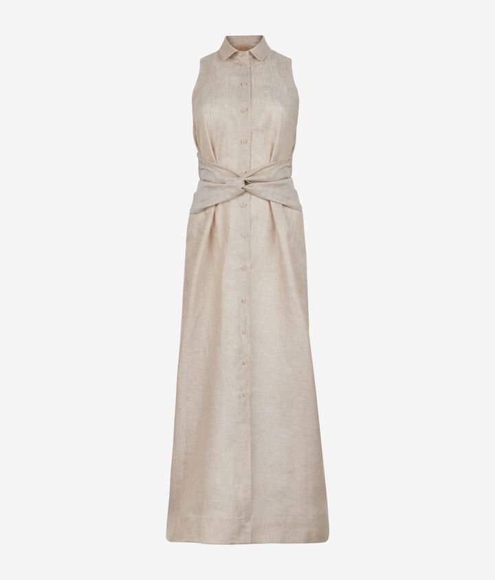 Accentuates the shape further, allowing styling versatility to suit any occasion. The sleeveless cut keeps the look fresh, while the classic collar and front button closure add a tailored finish that elevates the dress beyond casual wear. Crafted in linen for a naturally breathable and lightweight feel, this gathered waist dress combines ease with refinement. Whether styled with simple sandals for day or elevated with delicate accessories for evening, this crossover dress is a versatile staple that transitions seamlessly across settings. Discover the elegance of linen in a dress designed to move beautifully with you.