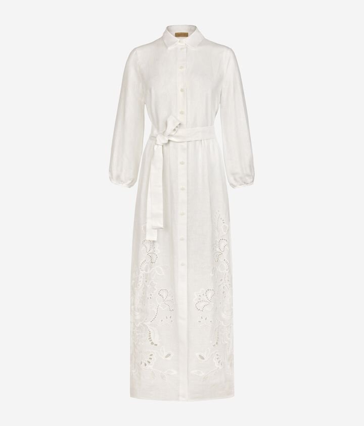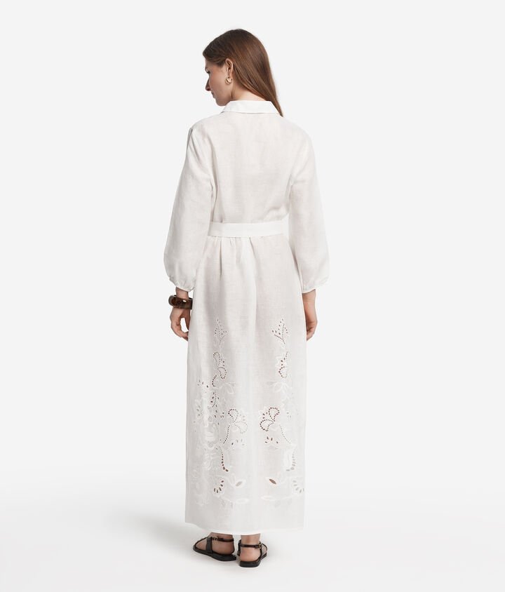 Perfect for bright days and evenings with a bohemian flavor, this dress in refined embroidered linen combines lightness and charm. The classic collar frames the neckline, while the front opening adds a feminine touch. Three-quarter-length sleeves with elastic ruffles create a delicate volume and close with concealed buttons for a minimal and essential effect.