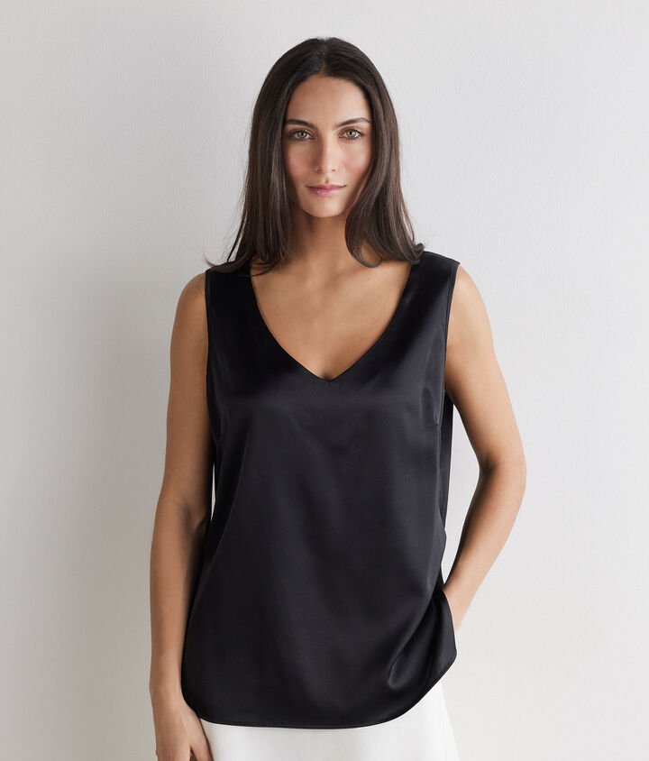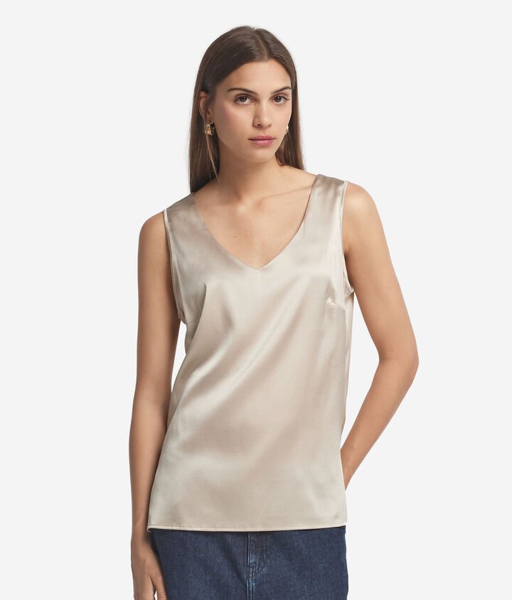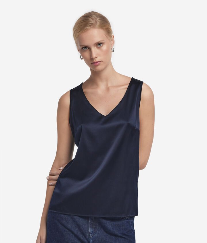The sleeveless V neck top follows the lines of the body with a relaxed, flattering shape. Wide straps stay comfortably in place throughout the day, while the smooth silk texture feels cool against the skin. Thanks to its breathable design and clean finish, it’s ideal for layering under jackets, cardigans, or tailored pieces without adding bulk. Subtle details and premium silk make this silk tank top a refined staple in any transitional wardrobe. Whether worn alone or layered, it offers comfort, movement, and quiet sophistication. Falconeri’s silk camisole top is thoughtfully constructed with lasting quality in mind. Whether you opt for a soft neutral or a standout navy silk camisole, each variation is made to be worn often and kept for seasons to come.