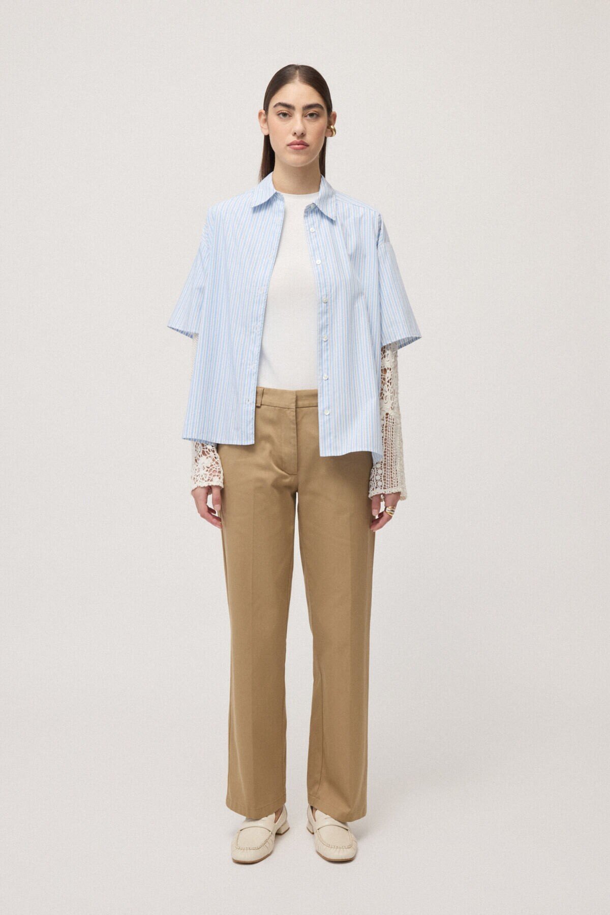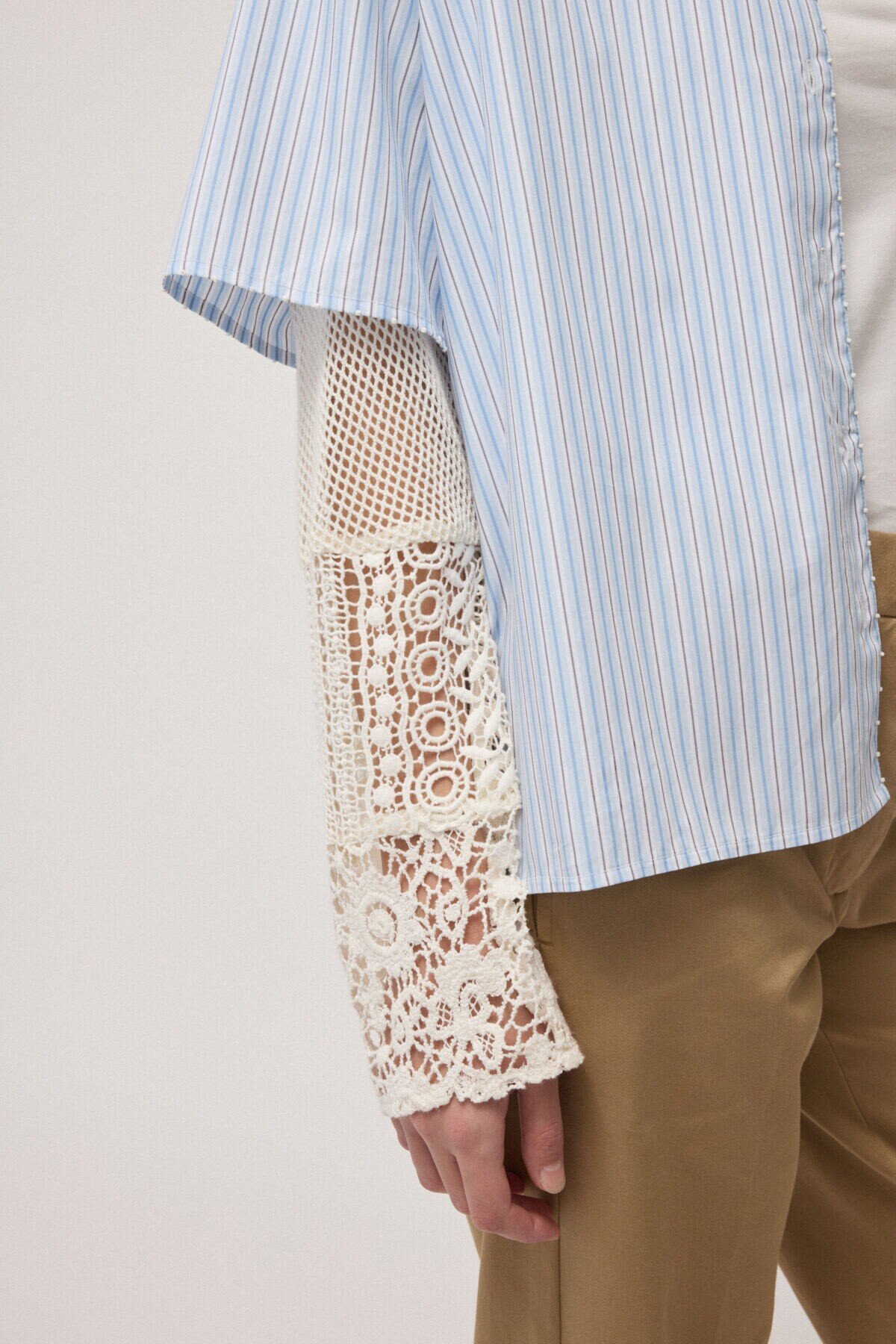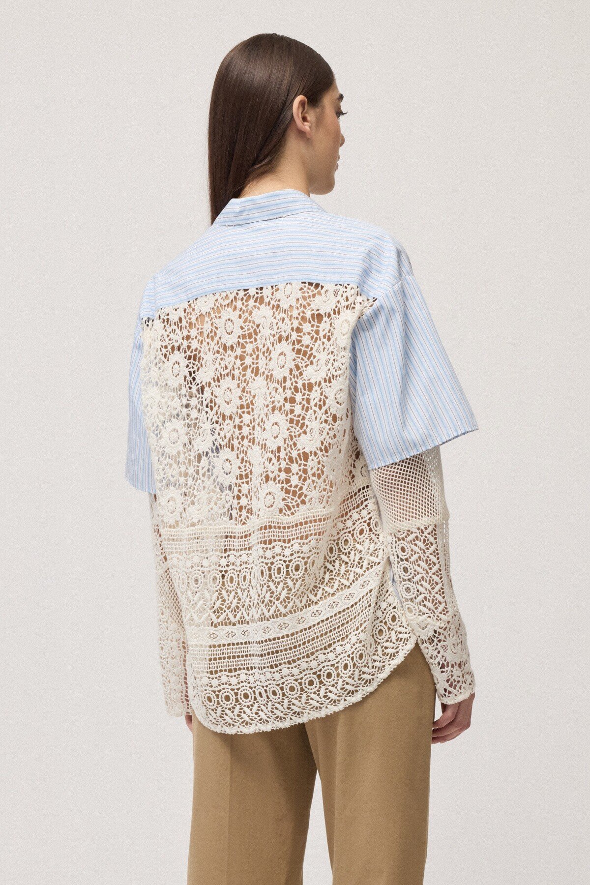 Double-layer shirt in striped cotton poplin, embellished with contrasting macramé inserts. The mix of materials and layered construction reinterpret the classic shirt with a modern twist, making it ideal for city looks and sophisticated everyday outfits.