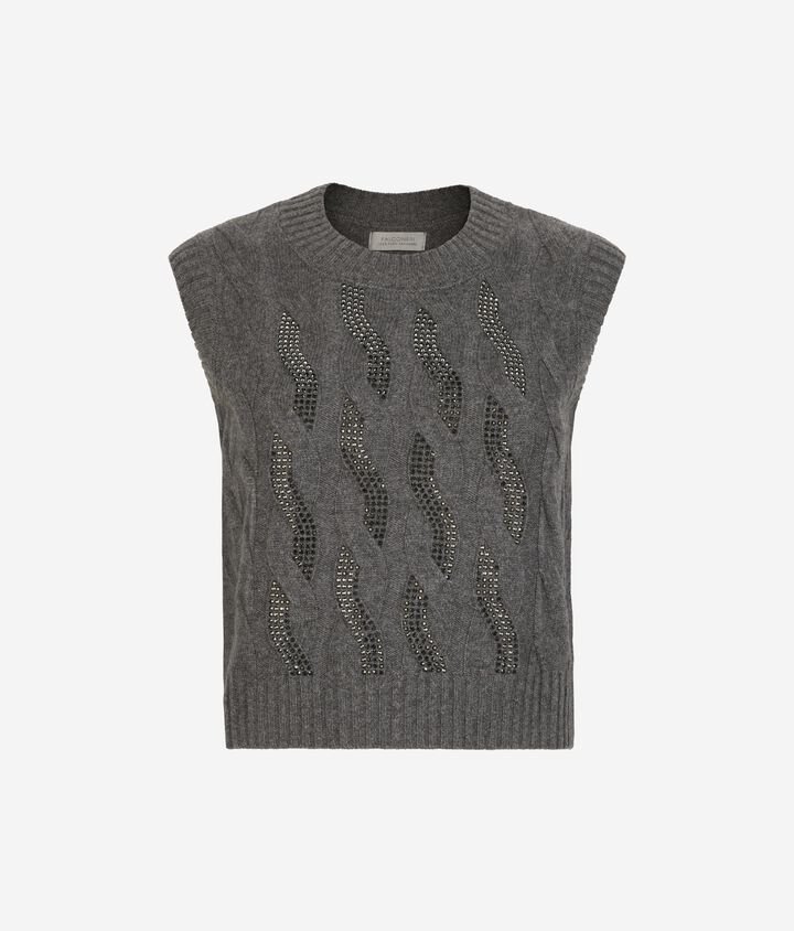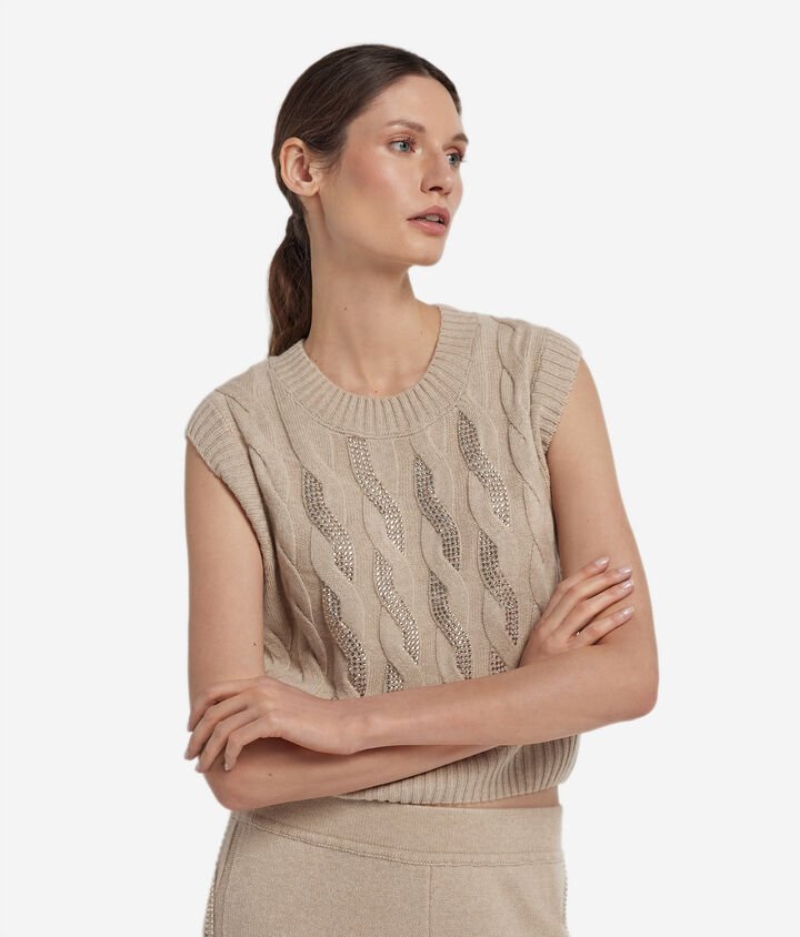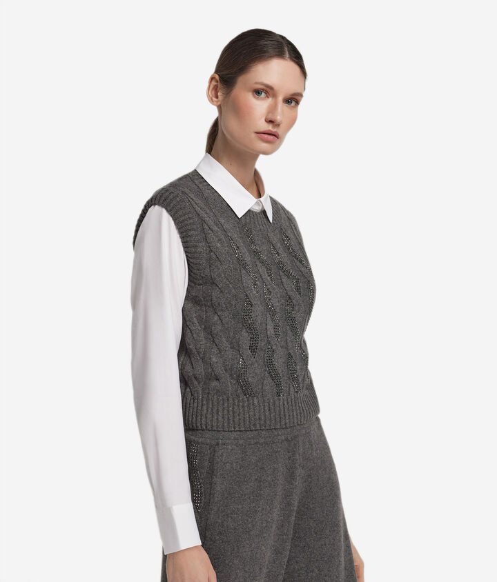 Made of fine Ultrasoft Cashmere, this vest combines softness and character in a single piece. The cable-knit design with delicate rhinestones adds movement and light, while the clean crewneck and ribbed finishes define balanced lines. The above-the-hip length and regular fit enhance the silhouette with natural sophistication. A garment that combines comfort and modern allure, interpreting the precious simplicity of everyday luxury.