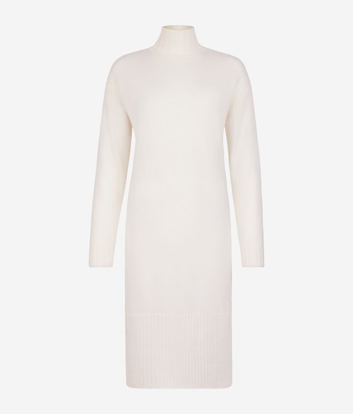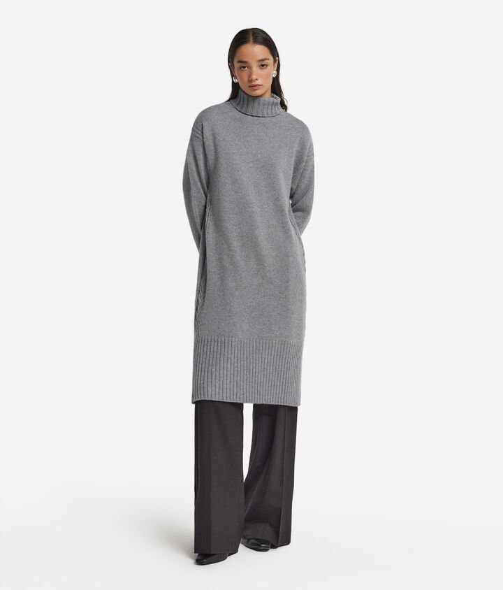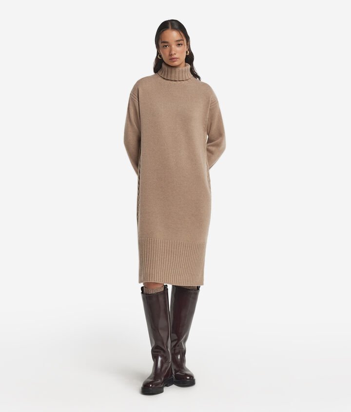Soft Ultrasoft Cashmere and refined design for a dress that envelops you with class. The turtleneck and slightly dropped shoulders create a relaxed yet sophisticated allure, while the vertical cable-knit workmanship on the hips elegantly define the silhouette. Ribbed details on the collar, hem and cuffs add character and small slits at the hem ensure movement, which together with the knee length are perfect for any occasion.