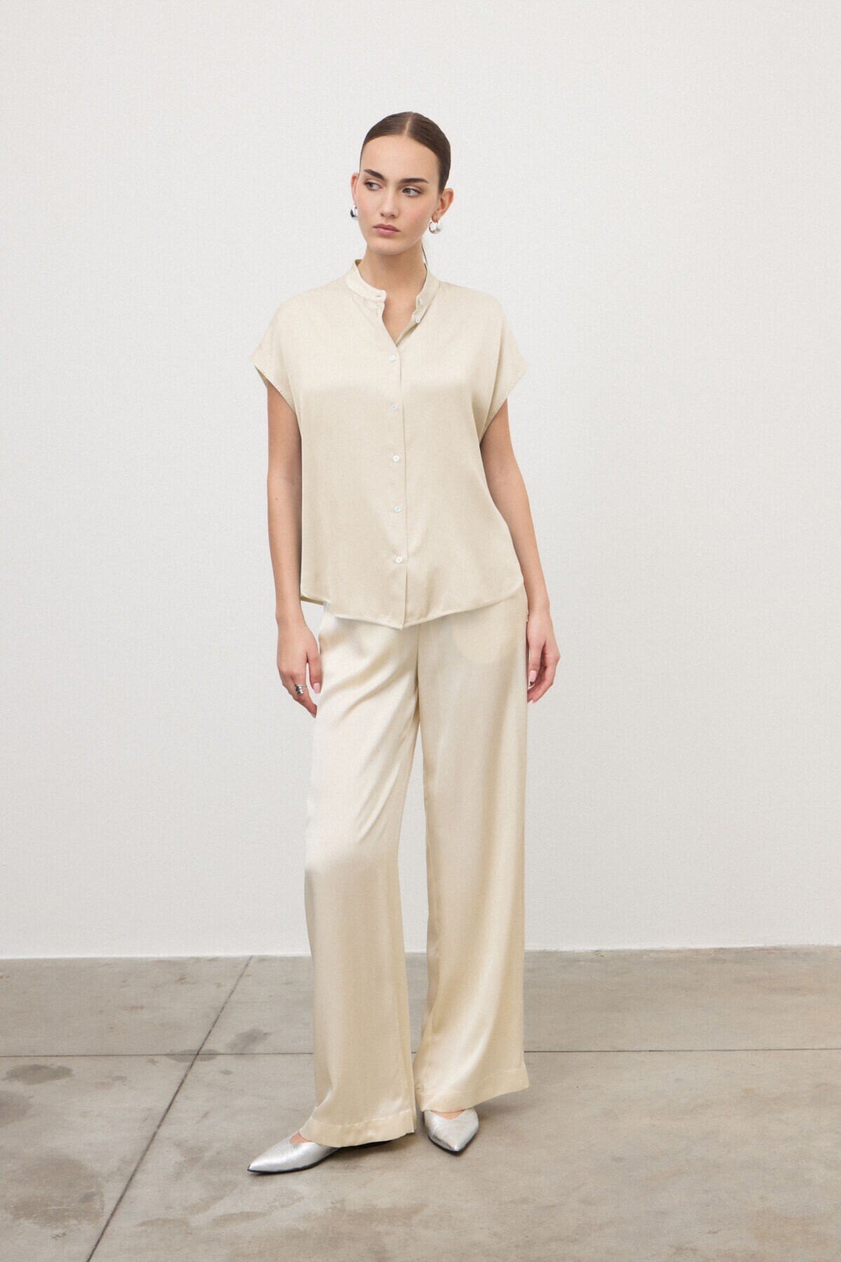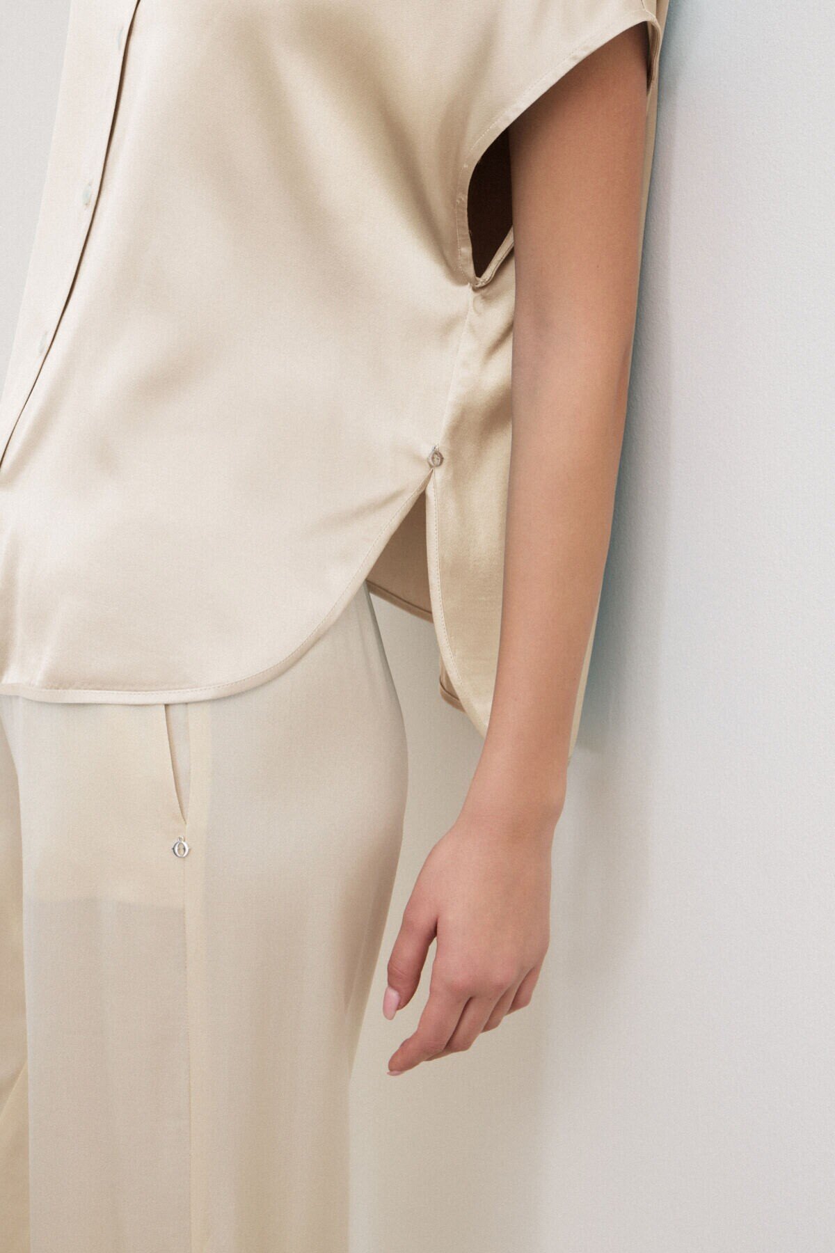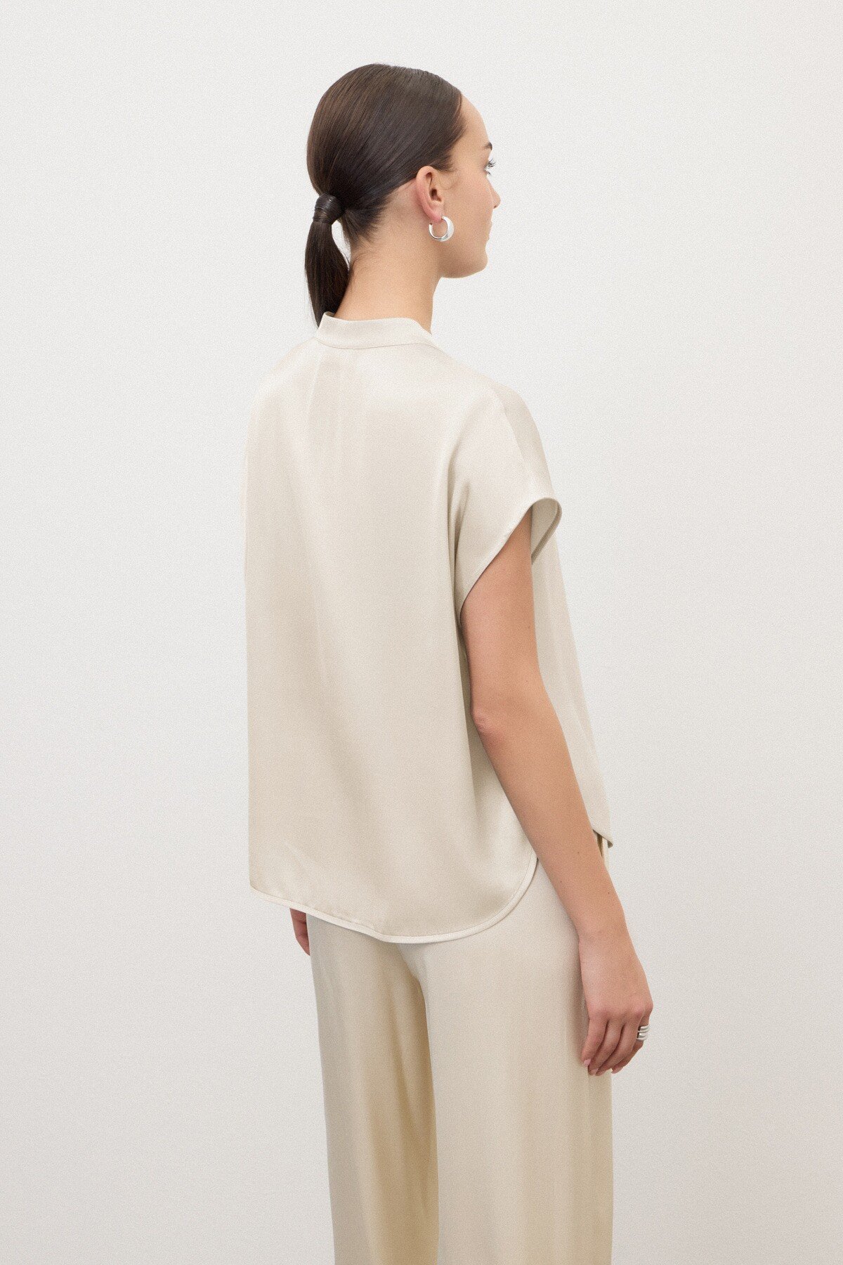 Sleeveless shirt in 100% viscose satin with a mandarin collar and rounded hem. An ideal summer piece, designed to be worn with flowing trousers or midi skirts for a casual and relaxed look.